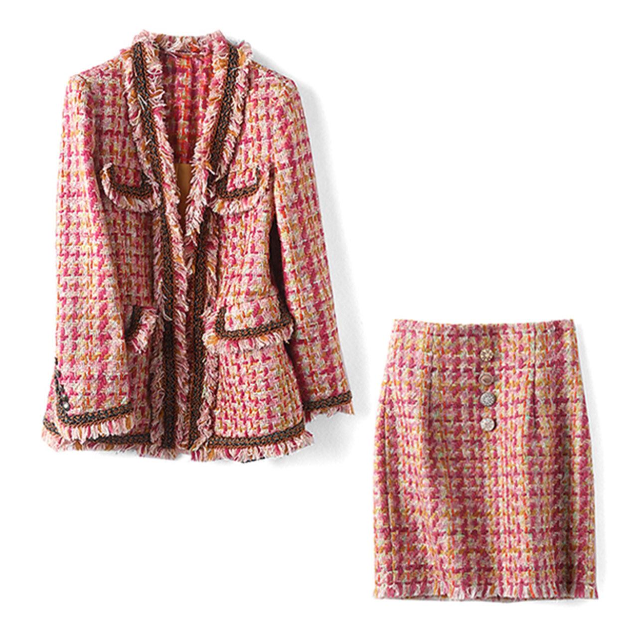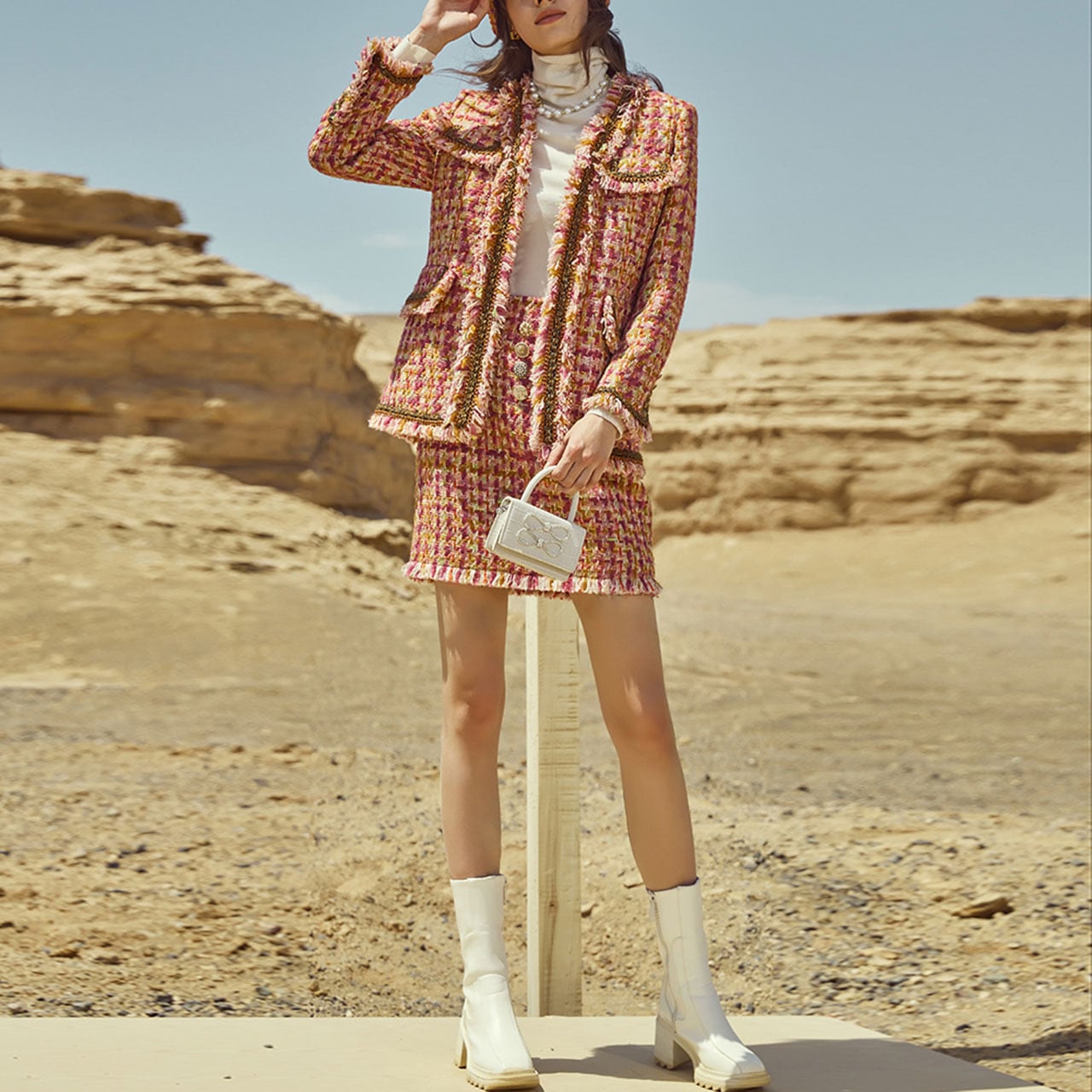 ジャケットとショートスカートの組み合わせで、オフィスやパーティーなど様々なシチュエーションで活躍することができます。